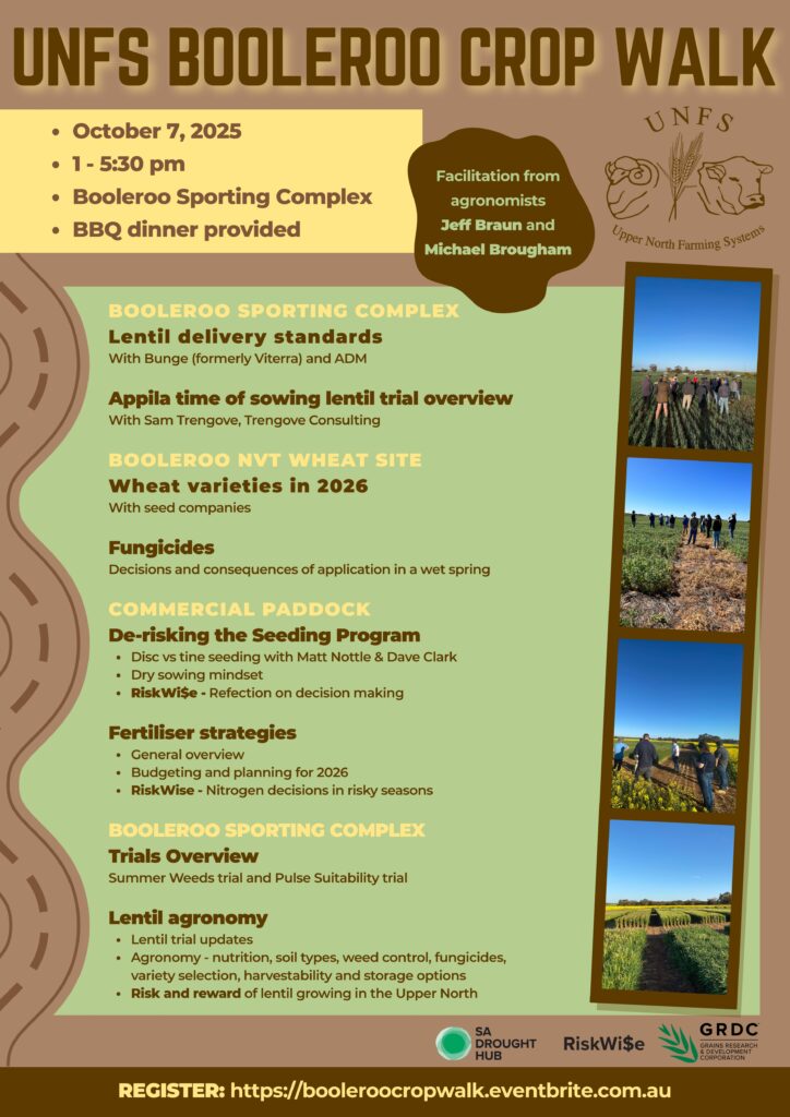 Organizer Upper North Farming Systems Location Booleroo Centre Sporting Complex 46-54 Arthur Street, Booleroo Centre SA Other Locations UNFS Commercial Paddock 2142-2126 Booleroo Rd, Booleroo Centre SA 5482 Wheat NVT Booleroo Centre From the corner of Booleroo Road and Roocke Road, drive 1.3 km down Roocke Road. The gate is on the left just before the bend. Copy the following exactly as is into Google or Apple Maps to view exact address: 32°48'02.7"S 138°20'52.2"E More Info Get a (free) ticket Date 07 Oct 2025 Expired! Time Dinner provided post event 1:00 pm - 5:30 pm Booleroo Crop Walk + Add to Google Calendar + iCal / Outlook export