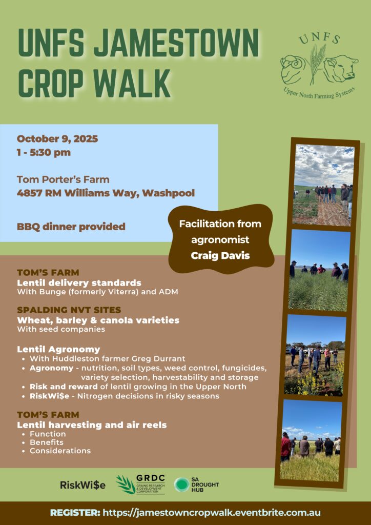Organizer Upper North Farming Systems Get a (free) ticket Location Tom Porter's Shed 4857 RM Williams Way, Washpool Other Locations Canola NVT Spalding 823 Hacklins Corner Rd Wheat and Barley NVT Site Spalding From the corner of RM Williams Way and Ward Hill Road, drive 500 m down Ward Hill Road. The NVT site is through the first gate on the left, just before the house. More Info Get a (free) ticket Date 09 Oct 2025 Time Dinner provided post event 1:00 pm - 5:30 pm UNFS Jamestown Crop Walk + Add to Google Calendar + iCal / Outlook export
